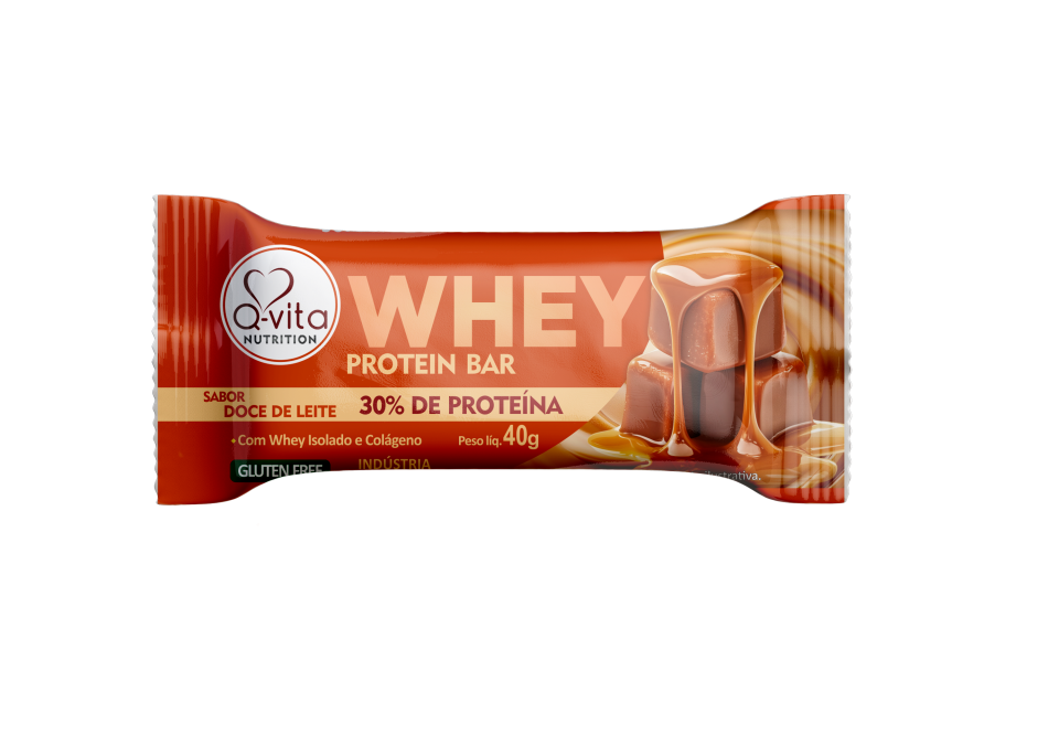 A Barra Whey Protein Q-vita Doce de Leite vem com 30% de proteína e é a dose de proteína pro seu pós-treino, lanche ou sobremesa. Feita com proteínas de alto valor biológico, tem suas fontes proteicas na proteína concentrada do soro do leite (WPC), proteína isolada do soro do leite (WPI), caseinato de cálcio e colágeno.