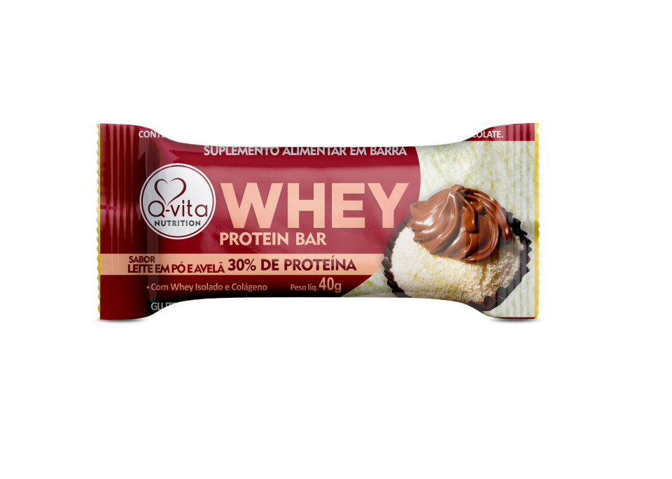 A Barra Whey Protein Q-vita Leite em Pó e Creme de Avelã vem com 30% de proteína e é a dose de proteína pro seu pós-treino, lanche ou sobremesa. Feita com proteínas de alto valor biológico, tem suas fontes proteicas na proteína concentrada do soro do leite (WPC), proteína isolada do soro do leite (WPI), caseinato de cálcio e colágeno. Sua composição auxilia na formação dos músculos, fornece energia, aumenta a saciedade, ajuda na recuperação e ganho de massa muscular, evitando o catabolismo. Elaborada com ingredientes selecionados e sem glúten como whey protein, a deliciosa cobertura de chocolate meio amargo, leite em pó e um recheio de ganache sabor chocolate com avelã que possui uma cremosidade incrível, é perfeita para qualquer momento do dia, em especial como sobremesa para substituir facilmente alimentos doces, pois sua textura é macia e o sabor é único.
